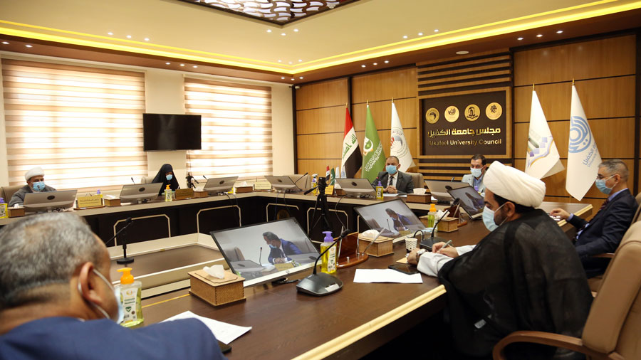 عقد مجلس جامعة الكفيل اجتماعه الدوري على قاعة مجلس الجامعة اليوم السبت الموافق 2021/8/7 وترأس الاجتماع السيد رئيس الجامعة الدكتور نورس محمد شهيد الدهان وقد حضر السادة مساعدي رئيس الجامعة للشؤون العلمية والادارية والسادة عمداء الكليات ورؤساء الأقسام العلمية وجرى خلال الاجتماع مناقشة سير الامتحانات النهائية للعام الدراسي 2020-2021، واكد السيد رئيس الجامعة على ضرورة الالتزام بإجراءات اللجنة العليا للصحة والسلامة الوطنية من خلال التباعد الاجتماعي والالتزام بالتعليمات الخاصة بالبيئة الاكاديمية والعمل بروح الفريق الواحد ومتابعة سير العملية التربوية .