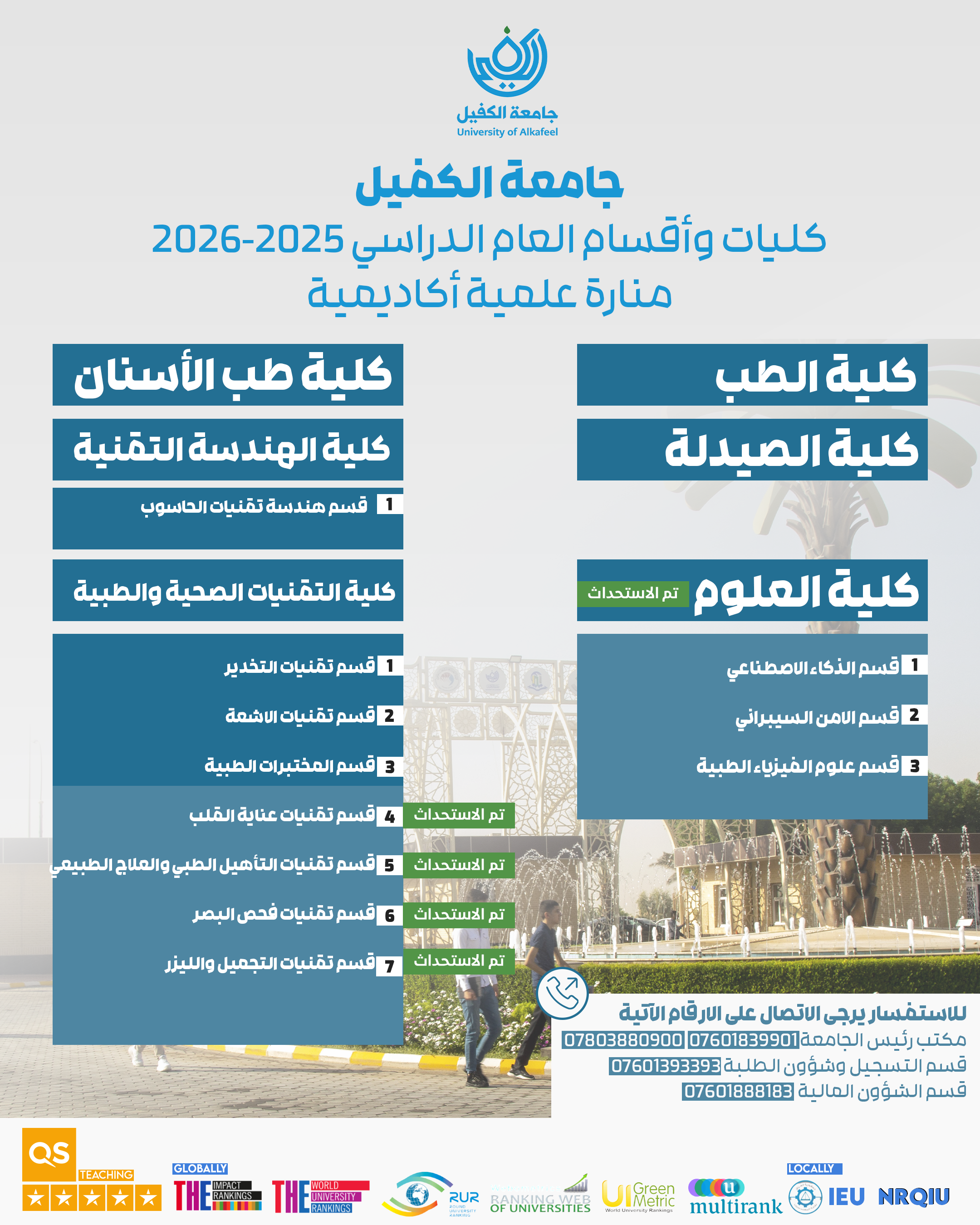 تُعد جامعة الكفيل من المؤسسات التعليمية البارزة في العراق إذ تجمع بين الأصالة والحداثة عبر كلياتها وأقسامها التي تواكب أحدث المستجدات العلمية والطبية والهندسية بما ينسجم مع متطلبات سوق العمل المحلي والدولي.