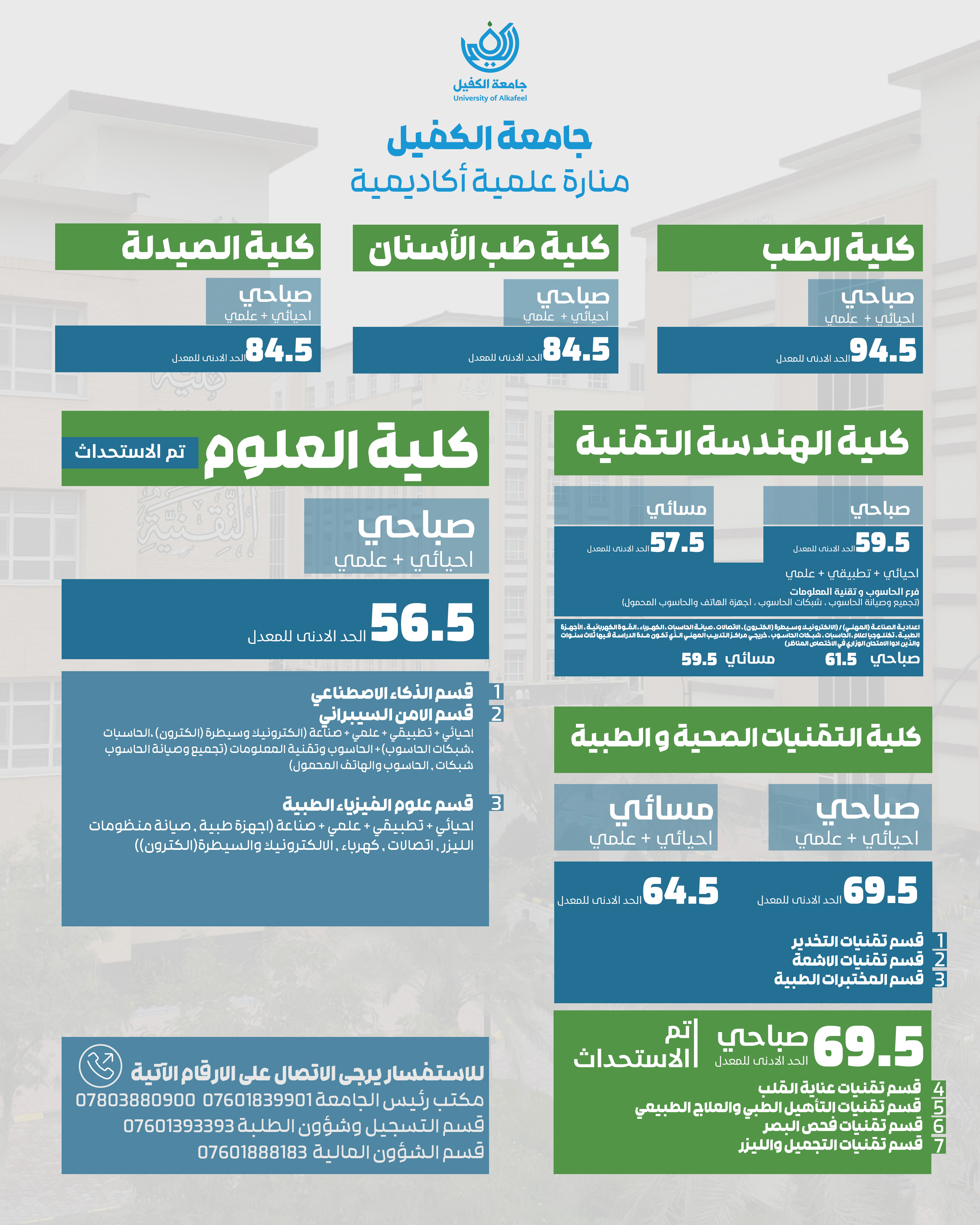 أقسام وكليات جامعة الكفيل وحدود القبول وفق تعليمات العام الماضي.