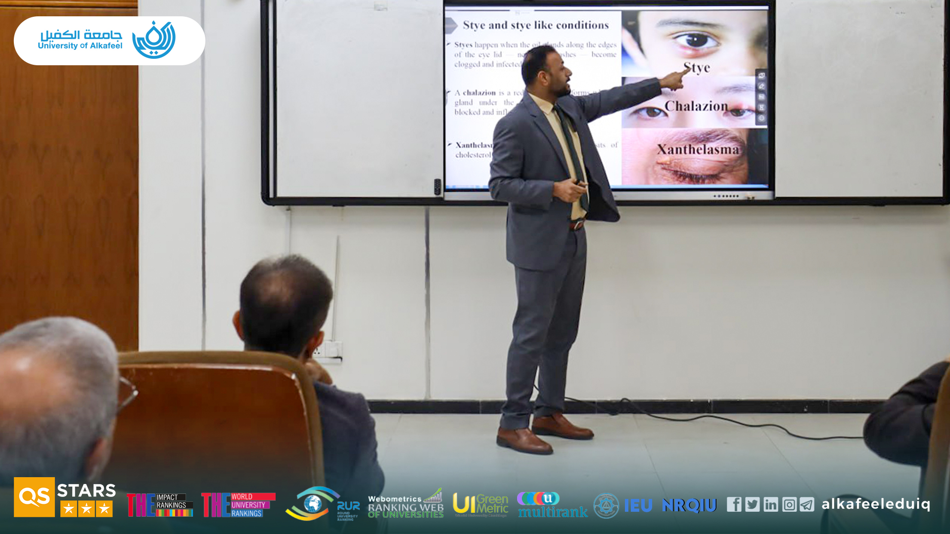 نظّمت وحدة التعليم المستمر في كلية الصيدلة بجامعة الكفيل يوم الأحد الموافق 2025/11/23 حلقة نقاشية علمية بعنوان "صحة العين" قدّمها الأستاذ المساعد الدكتور سالم فايز كاظم.