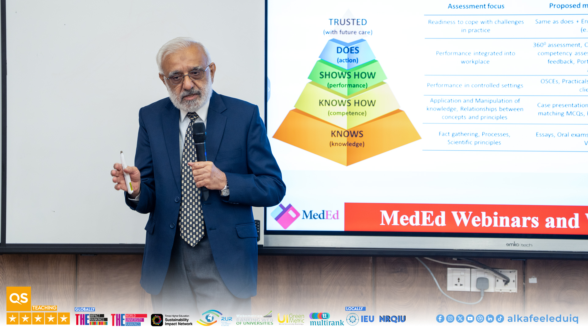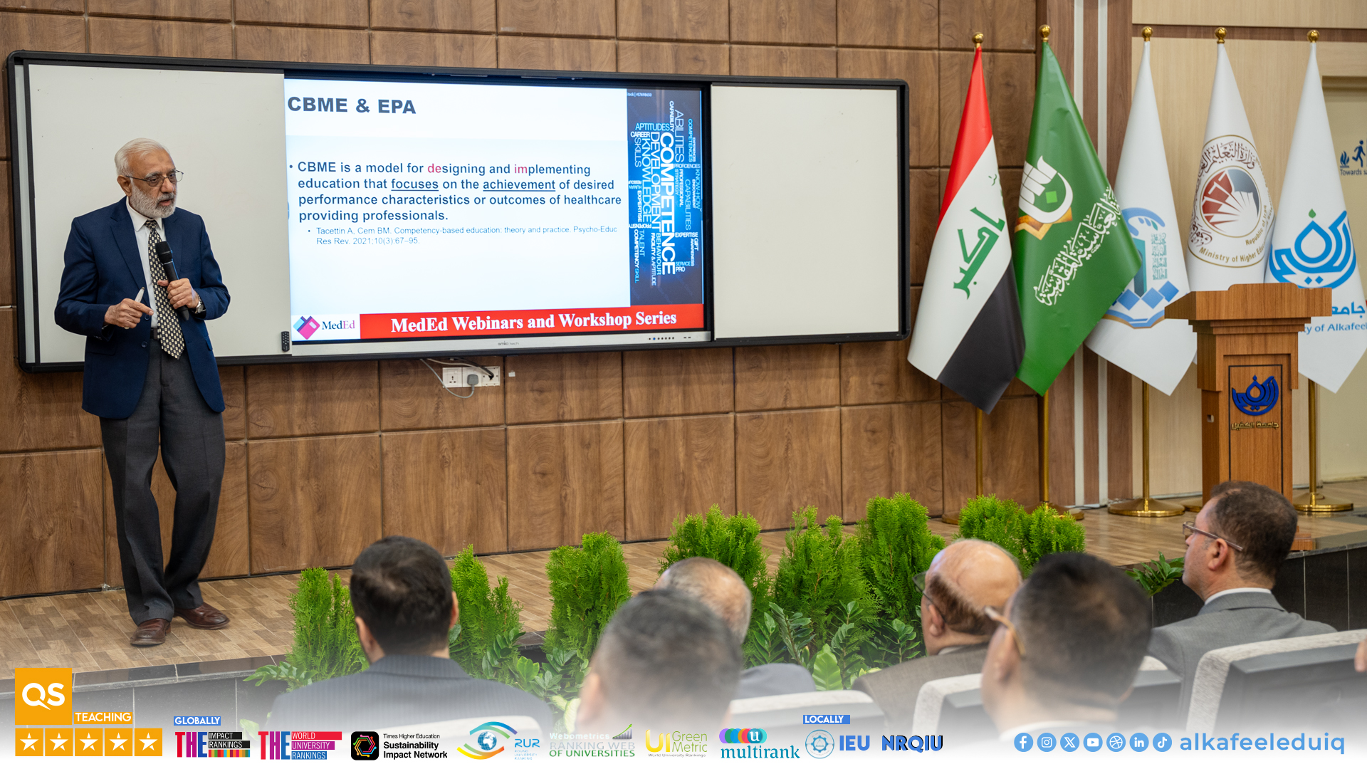 وقدّم البروفيسور الدكتور عالم بشير مالك سلسلة من المحاضرات النوعية حول التعليم الطبي القائم على الكفاءات (Competency-Based Medical Education) وتقييم امتحانات الأوسكي (OSCE Examination) والتي لاقت تفاعلًا كبيرًا وأسهمت في تعزيز مهارات التدريسيين وفق أحدث المعايير العالمية.