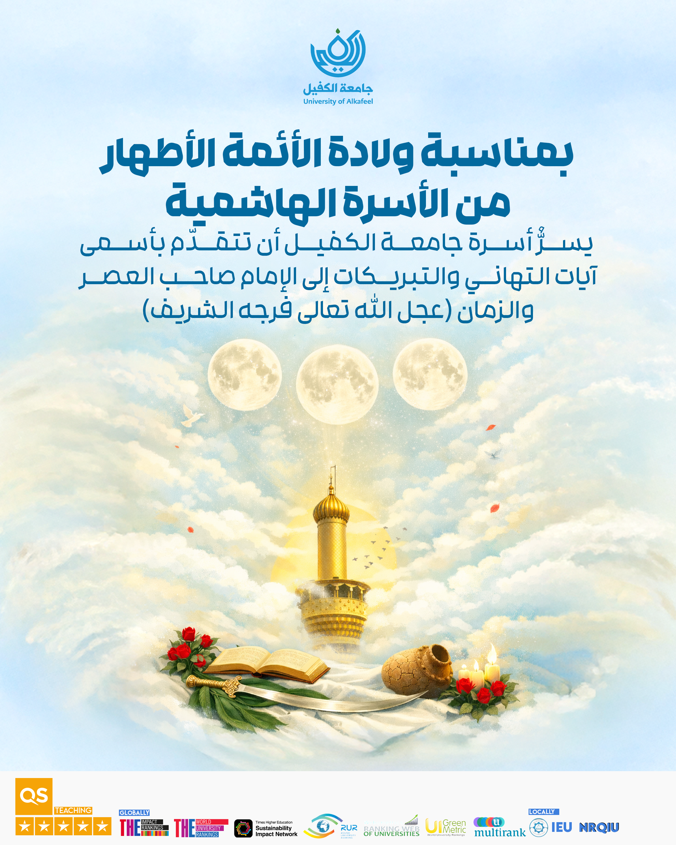 بمناسبة ولادة الأئمة الأطهار من الأسرة الهاشمية يسرُّ أسرة جامعة الكفيل أن تتقدّم بأسمى آيات التهاني والتبريكات إلى الإمام صاحب العصر والزمان (عجل الله تعالى فرجه الشريف) وإلى مراجعنا العظام وإلى جميع المسلمين في أنحاء العالم بمناسبة ولادة الأنوار الشعبانية: الإمام الحسين وأخيه العباس والإمام السجاد وعلي الأكبر عليهم السلام جميعًا.