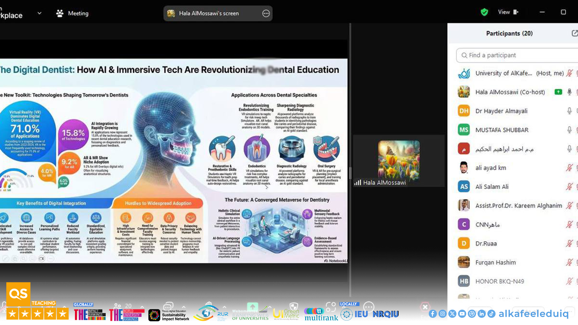 نظمت وحدة التعليم المستمر في كلية طب الأسنان بجامعة الكفيل محاضرة علمية بعنوان «Content Creation: AI Uses in Dental Education» ألقتها الدكتورة هالة رحمن الموسوي من جامعة أوكلاهوما وذلك عبر منصة Zoom يوم الثلاثاء الموافق 2026/1/27 في الساعة الثامنة والنصف مساءً.