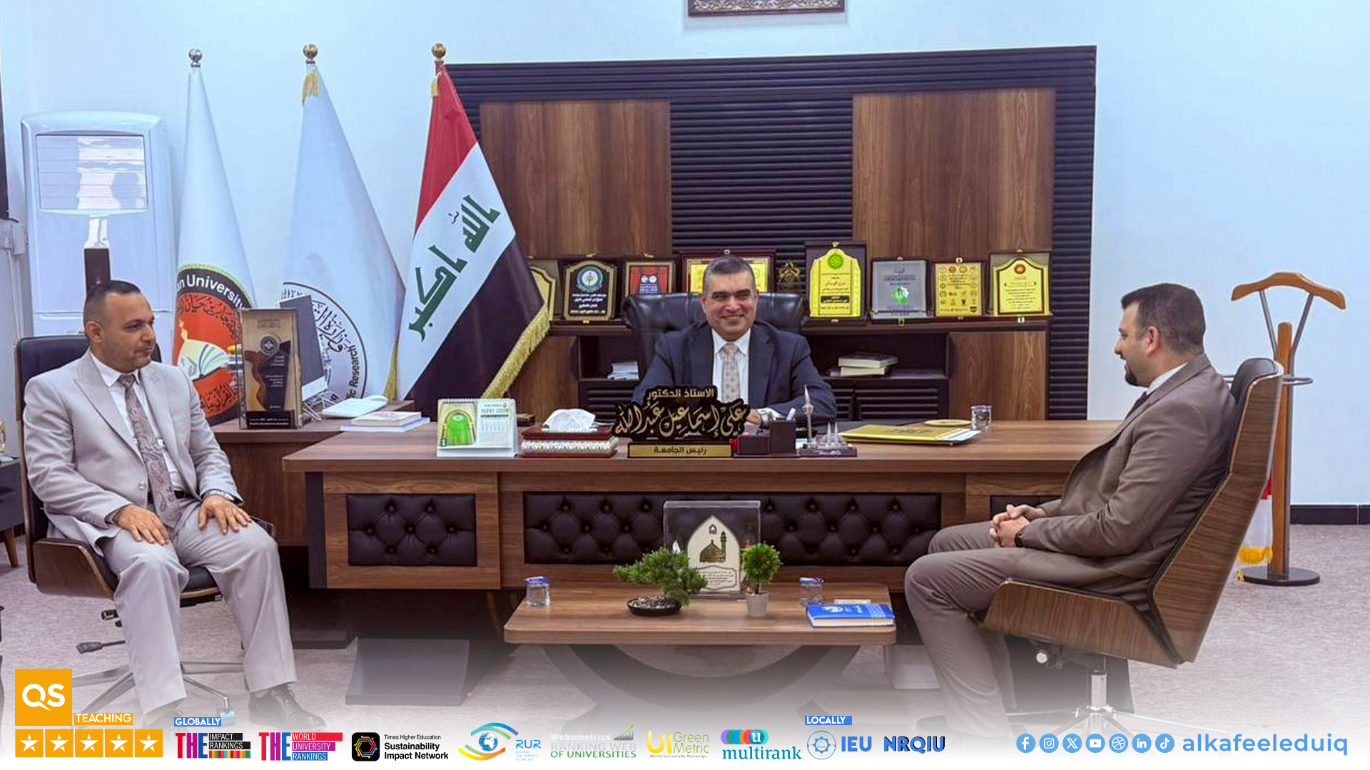 وعلى هامش إقامة الورشة تشرف السيد المحاضر بلقاء السيد رئيس جامعة جابر بن حيان للعلوم الطبية والصيدلانية الأستاذ الدكتور علي إسماعيل عبد الله محمد والسيد مساعد رئيس الجامعة للشؤون الإدارية الأستاذ الدكتور مهند حميد العطوي حيث جرى تبادل الحديث حول الجوانب العلمية والأكاديمية ذات الاهتمام المشترك ولا سيما موضوع الاعتماد الأكاديمي في الجامعات العراقية وعلاقته برصانة التعليم العالي.