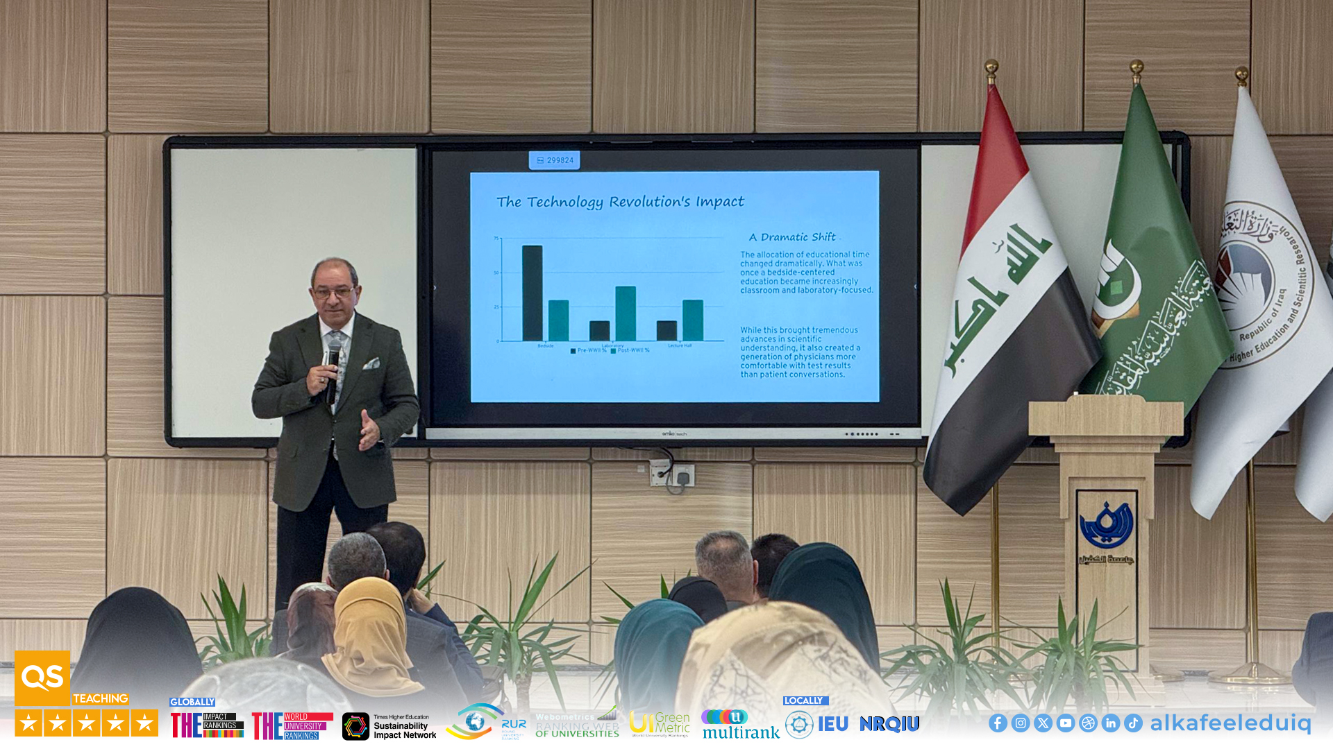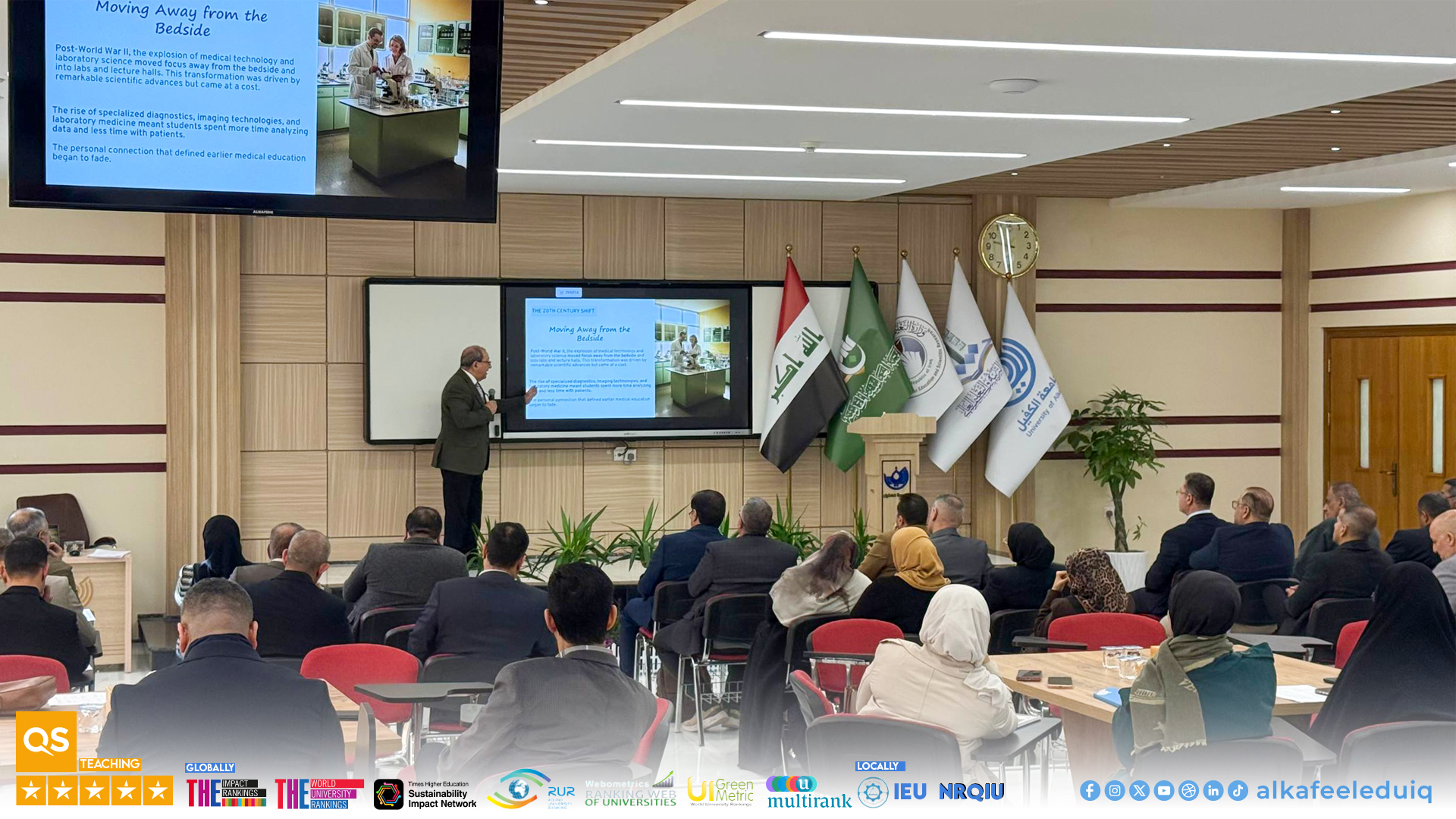 برعاية رئيس جامعة الكفيل الأستاذ الدكتور نورس محمد شهيد الدهان أقامت كلية الطب في جامعة الكفيل يوم السبت الموافق 2026/1/31 ورشة عمل تدريبية تخصصية بعنوان "تطوير مهارات المدربين السريريين ورفع كفاءة الأداء التدريبي" بالتعاون مع شبكة أطباء العراق للكلية الملكية البريطانية وأدارها الأستاذ الدكتور هلال الصفّار مستشار رئيس الجامعة للتعليم الطبي.