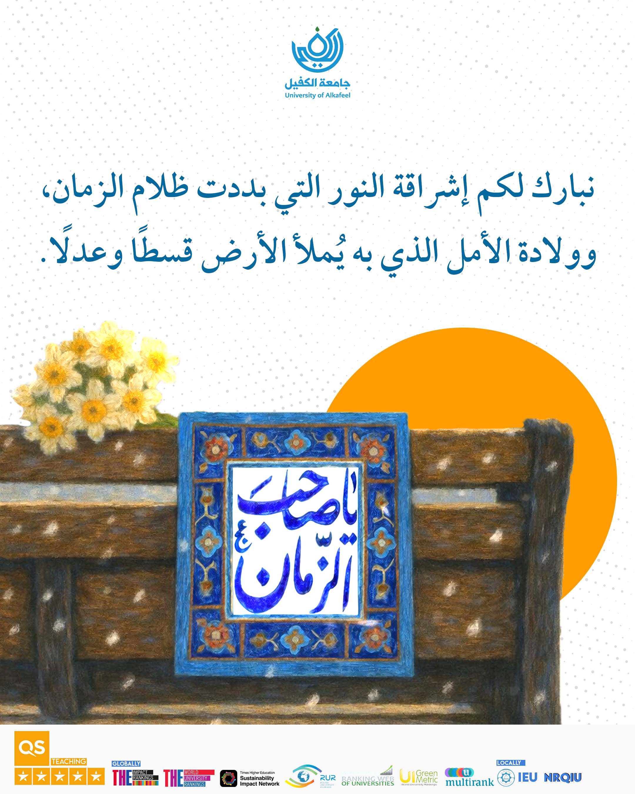 بمناسبة ذكرى ولادة الإمام صاحب العصر والزمان (عجّل الله تعالى فرجه الشريف) تتقدّم أسرة جامعة الكفيل بأسمى آيات التهاني والتبريكات إلى مقام الإمام المنتظر وإلى مراجع الدين العظام وإلى الأمة الإسلامية جمعاء.