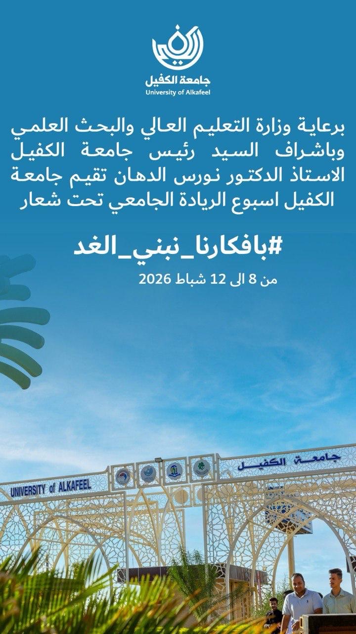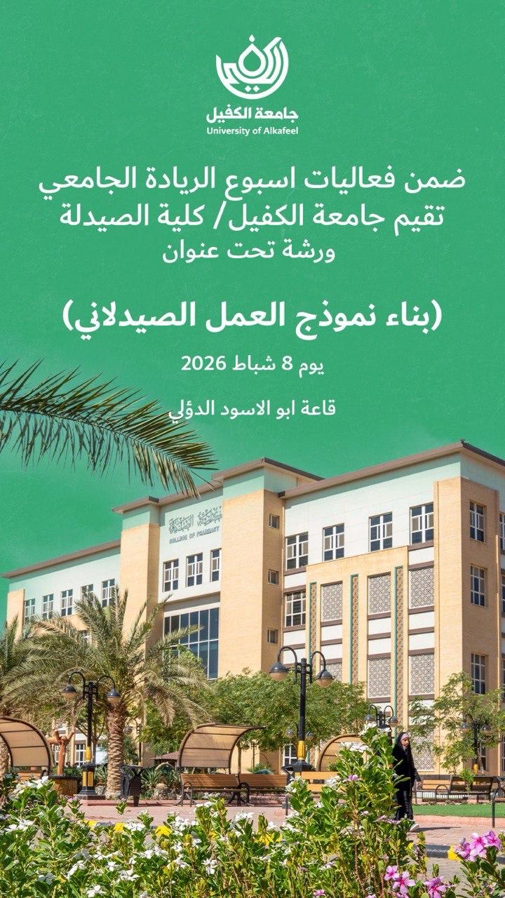 تدعو جامعة الكفيل طلبتها الكرام إلى المشاركة في الورشة التدريبية الأولى للمبتدئين بعنوان “بناء نموذج العمل الصيدلاني” وذلك ضمن برامجها الهادفة إلى تنمية المهارات الريادية في المجال الصيدلاني.