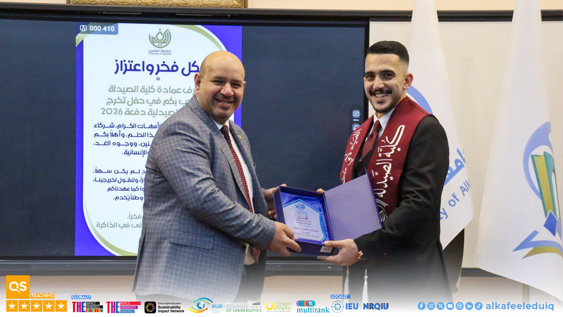 احتفلت جامعة الكفيل بتخريج الدفعة السادسة من طلبة كلية الصيدلة للعام الدراسي 2025–2026 بحضور الأستاذ الدكتور نورس محمد شهيد الدهان رئيس الجامعة وعميد كلية الصيدلة الأستاذ المساعد الدكتور سعد مشكور وليد ومعاونيه وأعضاء الهيئة التدريسية إلى جانب ذوي الخريجين يوم الأربعاء الموافق 2026/2/11.