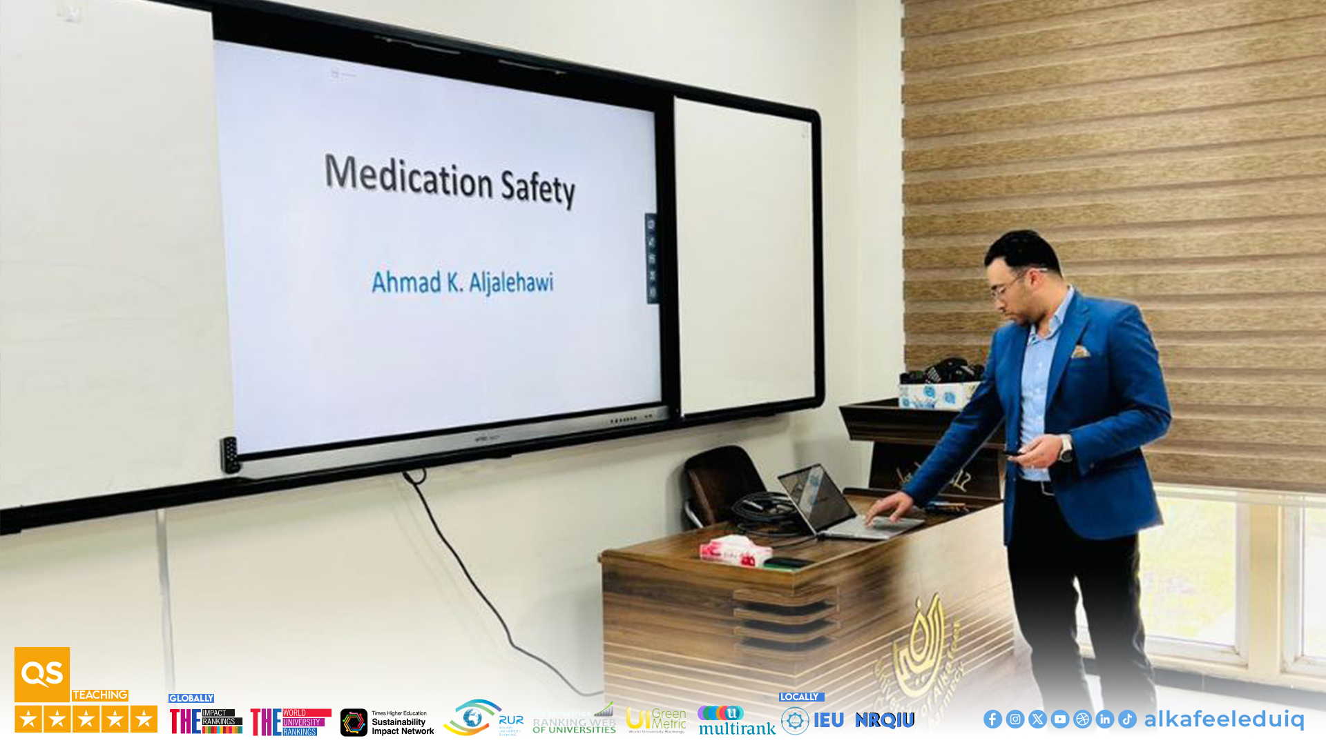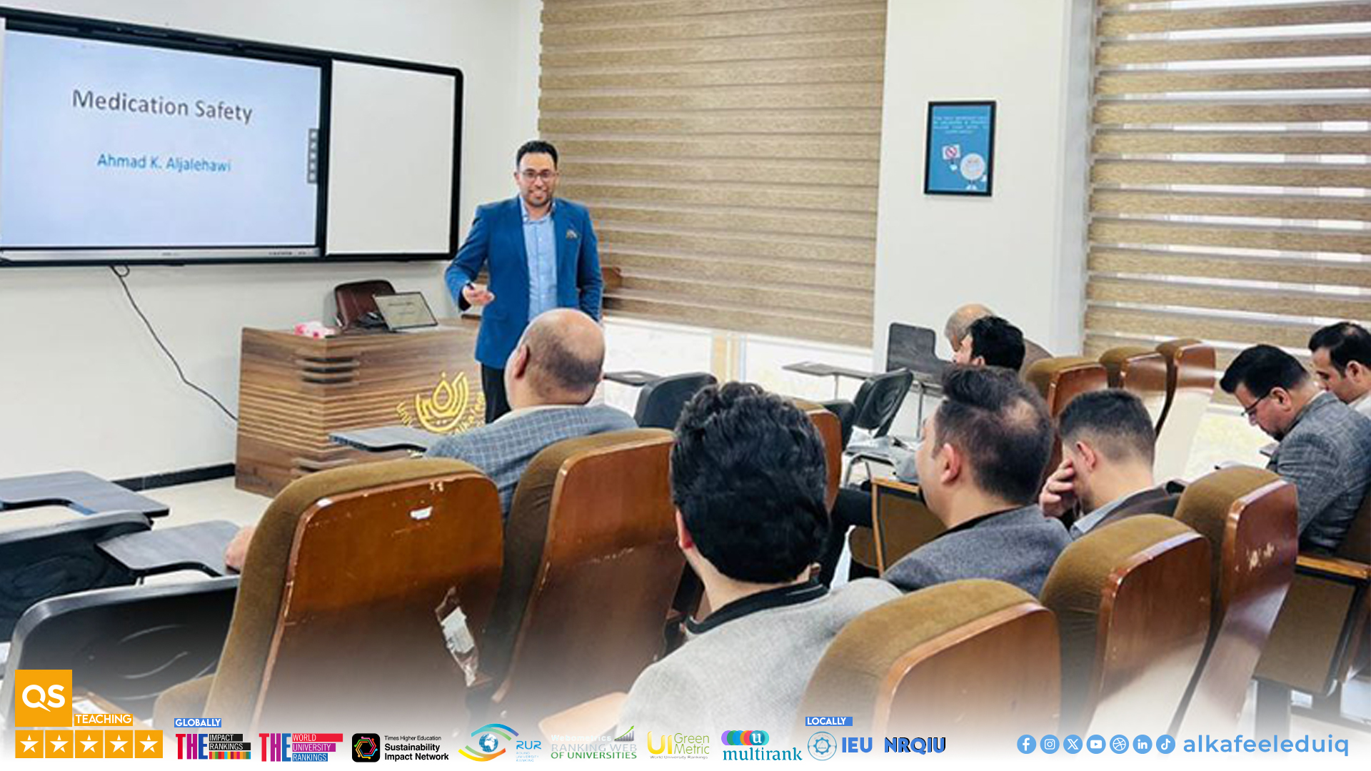 نظّمت كلية الصيدلة في جامعة الكفيل من خلال وحدة التعليم المستمر وبالتعاون مع فرع الصيدلة السريرية محاضرة علمية بعنوان “Medication Safety (السلامة الدوائية)” ألقاها المدرس أحمد كاظم عبد وذلك على قاعة البلاغي في كلية الصيدلة يوم الأحد الموافق 2026/2/22.