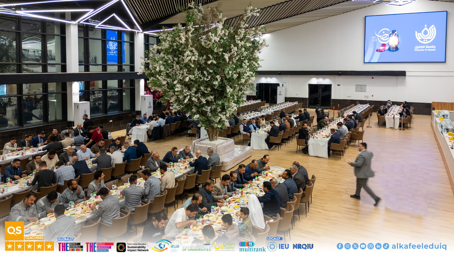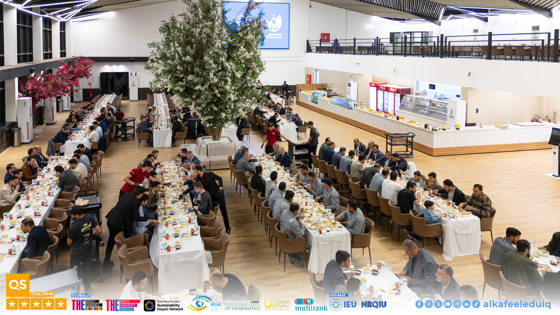 وفي هذا السياق أقامت الجامعة مأدبة إفطار رمضانية في النادي الطلابي داخل الحرم الجامعي يوم الأربعاء الموافق 2026/2/25 بحضور السيد رئيس الجامعة الأستاذ الدكتور نورس محمد شهيد الدهان والسادة العمداء والمعاونين وأعضاء الهيئتين التدريسية والإدارية وجميع منتسبي الجامعة.