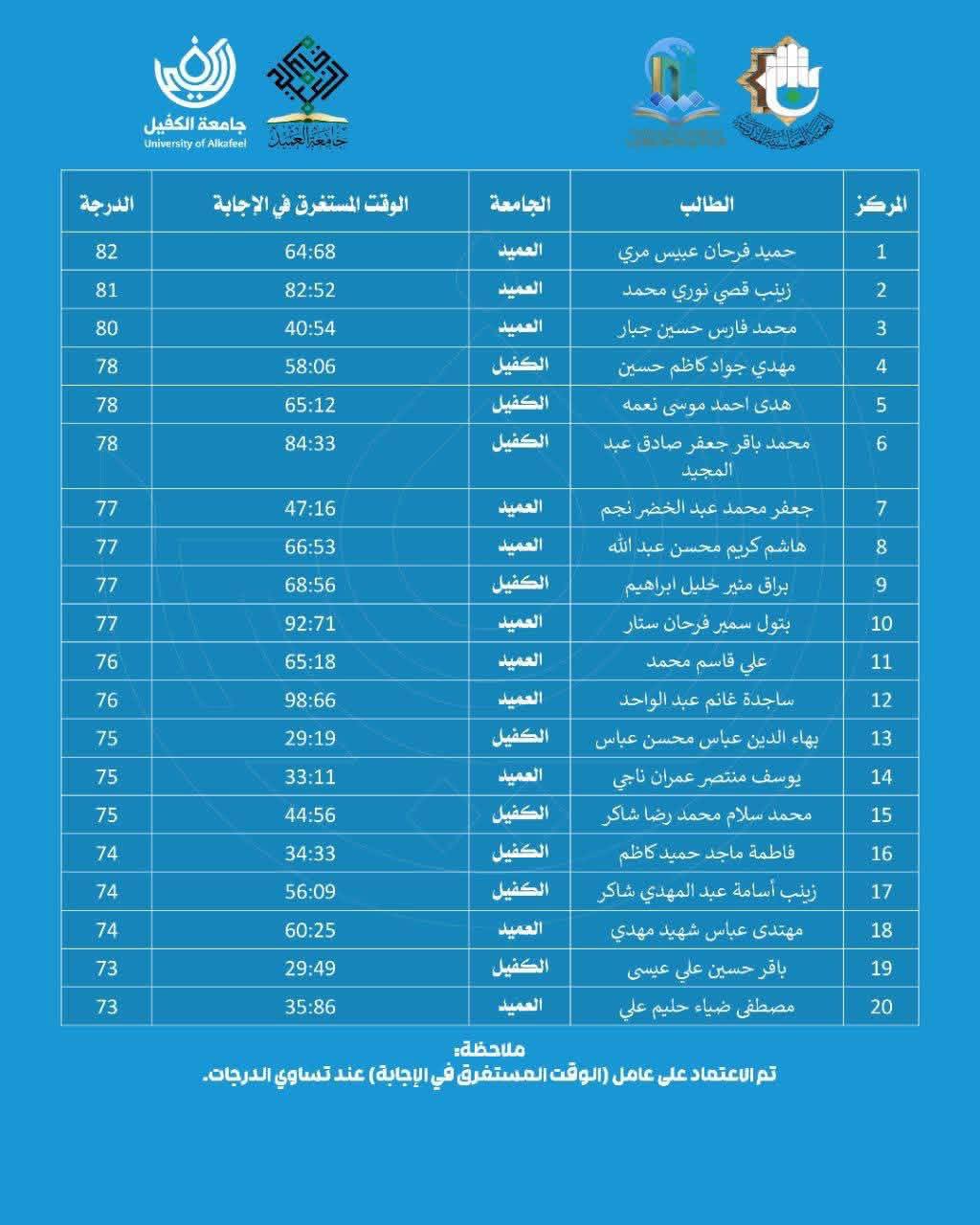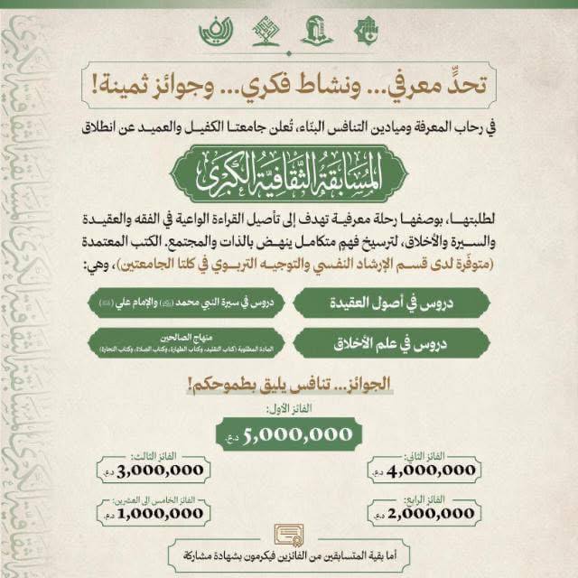 وشهدت المسابقة مشاركة متميزة لطلبة جامعة الكفيل الذين أظهروا مستوى علميًا وثقافيًا يعكس حرص الجامعة على دعم الأنشطة الفكرية والثقافية الهادفة إلى تنمية مهارات الطلبة وتعزيز حضورهم المعرفي.