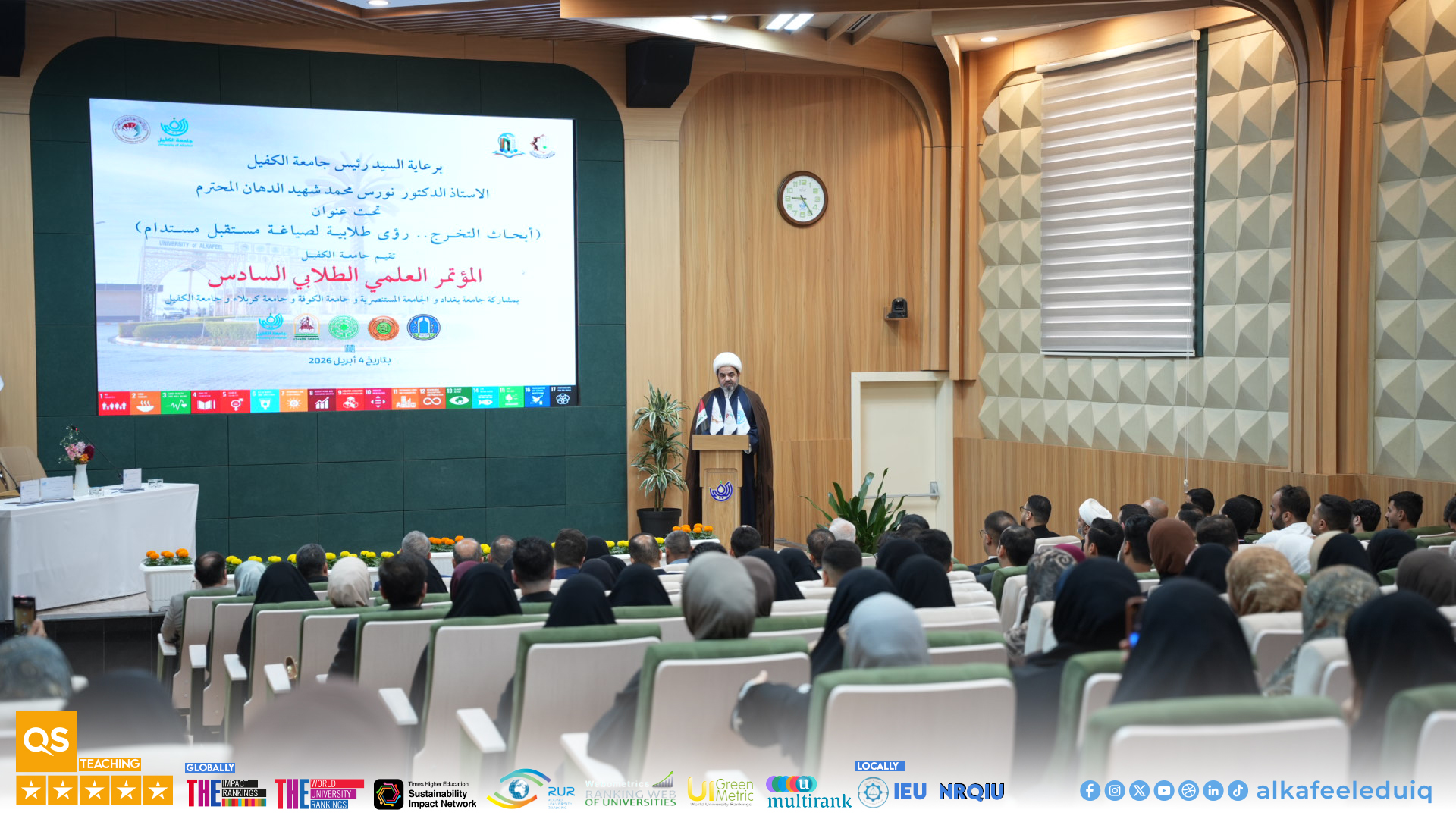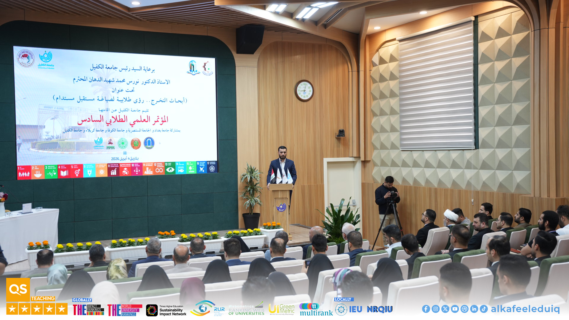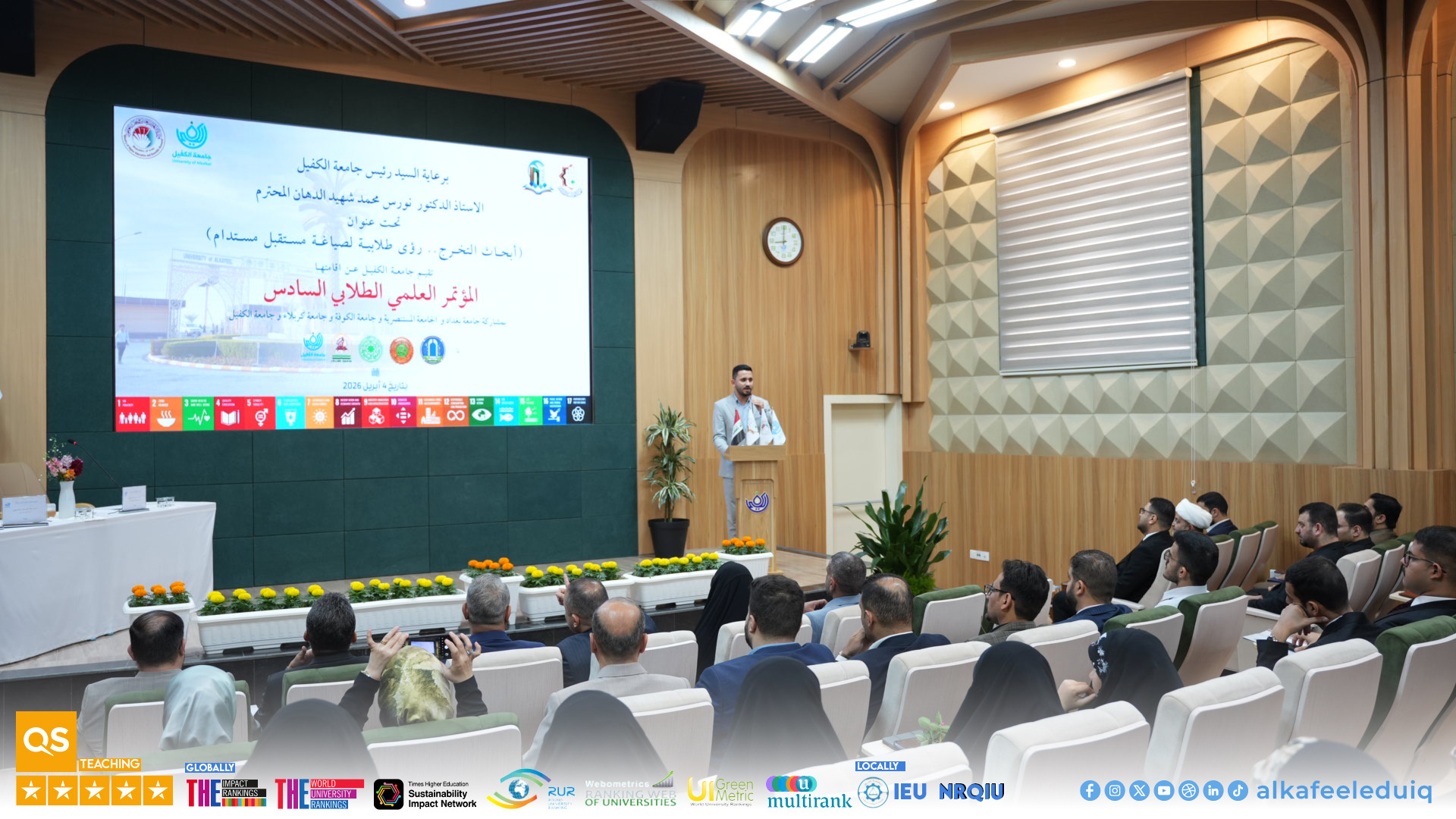 برعاية السيد رئيس جامعة الكفيل الأستاذ الدكتور نورس محمد شهيد الدهان المحترم تطلق جامعة الكفيل فعاليات المؤتمر العلمي الطلابي السادس تحت عنوان (أبحاث التخرج .. رؤى طلابية لصياغة مستقبل مستدام) وذلك ضمن أنشطتها العلمية للعام الدراسي 2025-2026 وبمشاركة نخبة من الجامعات العراقية.
