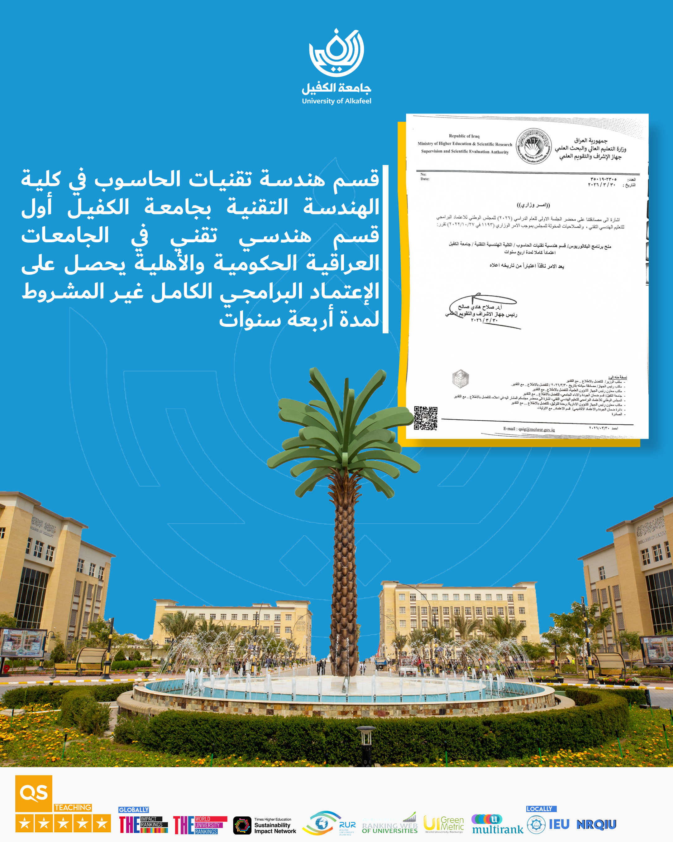 حقق قسم هندسة تقنيات الحاسوب في كلية الهندسة التقنية بجامعة الكفيل إنجازًا أكاديميًا بارزًا ليصبح أول قسم هندسي تقني في الجامعات العراقية (الحكومية والأهلية) يحصل على الاعتماد البرامجي الكامل غير المشروط لمدة أربع سنوات.